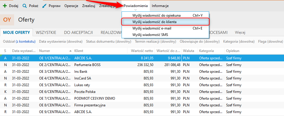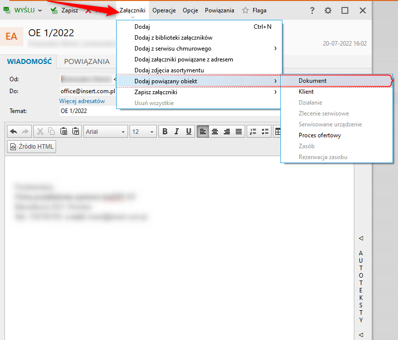 2. Jeżeli treść wiadomości ma być indywidualna (co jest częste w przypadku ofert dla klienta), użytkownik może wykorzystać opcję Powiadomienia – Wyślij wiadomość do klienta. Spowoduje to wywołanie okna nowej wiadomości, w którym, aby załączyć ofertę, należy wykorzystać opcję Załączniki – Dodaj powiązany obiekt – Dokument.