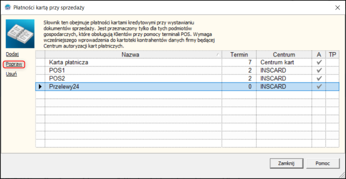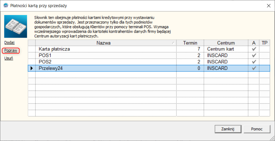1. Przejść do modułu Administracja – Słowniki – Płatności kartą przy sprzedaży, zaznaczyć wybraną formę płatności i kliknąć Popraw.