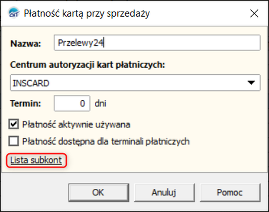 Opcję dodawania subkont można wykorzystać, jeśli płatność kartą przy sprzedaży jest wykorzystywana do oznaczeń płatności za pośrednictwem tzw. szybkich płatności, np. P24 czy PayU, przy synchronizacji ze sklepem internetowym, za pomocą rozwiązań własnych. Lista pozwala dodać do jednej płatności kilka subkont i określić, w jaki sposób mają być odczytywane pliki rozliczające wpłaty, dostarczone przez pośredników płatności. Zdefiniowane subkonto można wskazać podczas wczytywania plików dostarczonych przez pośrednika płatności w module Rozliczenia pośredników płatności. Aby dodać subkonto, należy:
