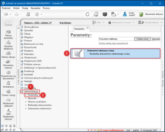 1. Z listy modułów wybrać Administracja – Parametry, a z listy parametrów Dokument odebrany z kasy.