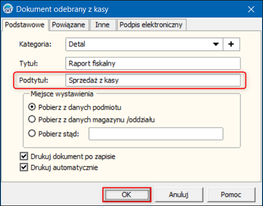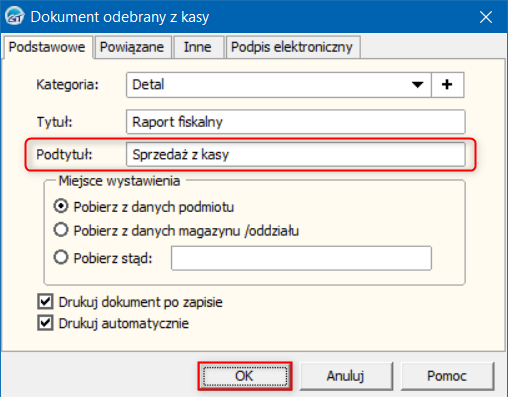 Subiekt GT – Jak ustawić domyślny podtytuł dokumentu odebranego z kasy?