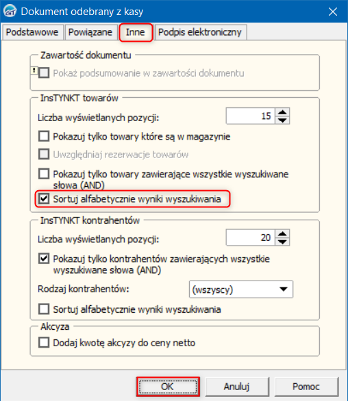 2. W oknie Dokument odebrany z kasy przejść na zakładkę Inne i zaznaczyć opcję Sortuj alfabetycznie wyniki wyszukiwania w sekcji InsTYNKT towarów. Zmiany zapisać przyciskiem OK.