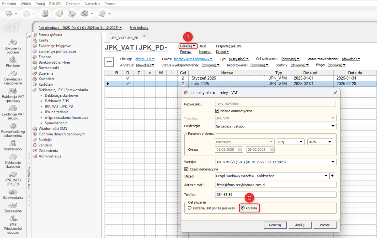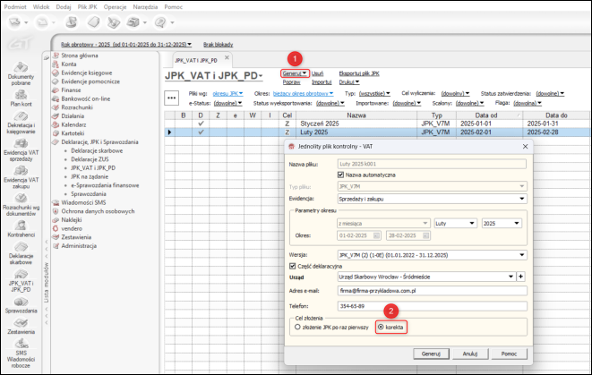 - Opcja Generuj (dostępna pod prawym przyciskiem myszy, w menu modułu lub w górnym menu Plik JPK): Umożliwia użytkownikowi wskazanie, z jakich części ma się składać plik korekty.
