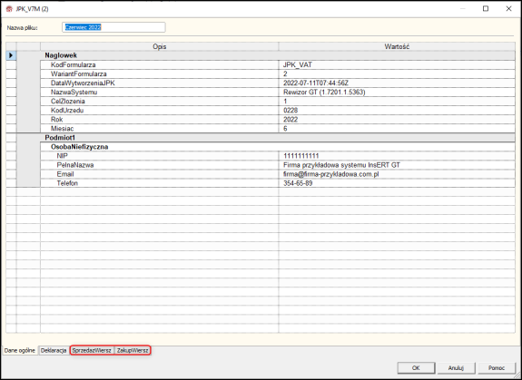 Aby zweryfikować jakie części składają się na wygenerowany plik, wystarczy go otworzyć. Jeżeli plik zawiera zakładkę Deklaracja, oznacza to włączoną część deklaracyjną, zakładki SprzedazWiersz i ZakupWiersz oznaczają włączoną część ewidencyjną. Po wygenerowaniu korekty jej wysyłka odbywa się w sposób identyczny, co pierwotnego pliku JPK.
