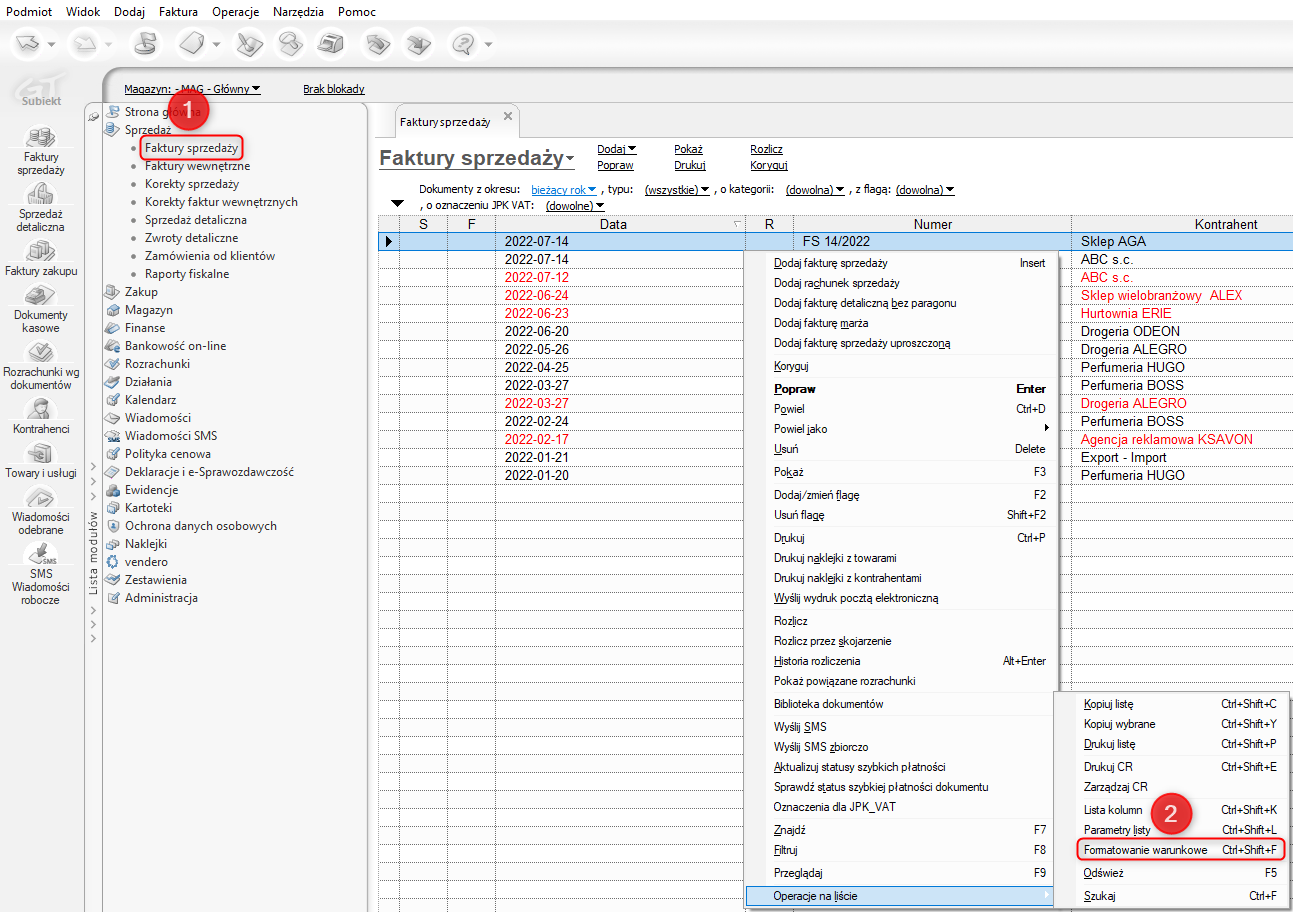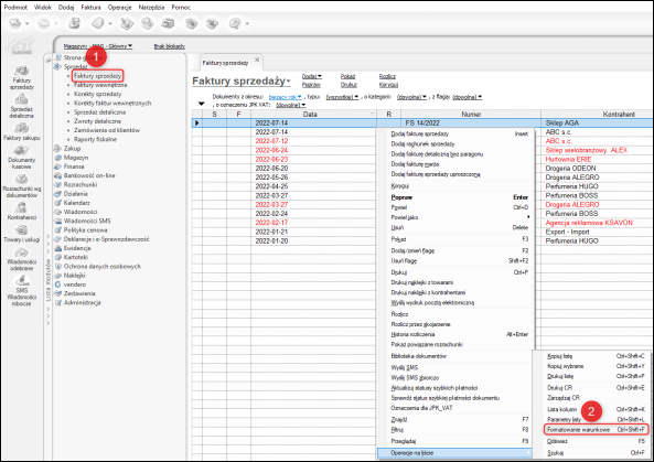 1. Z listy modułów wybrać Sprzedaż – Faktury sprzedaży, kliknąć listę Prawym Przyciskiem Myszy i wybrać Operacje na liście – Formatowanie warunkowe.