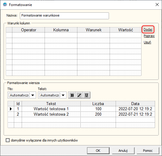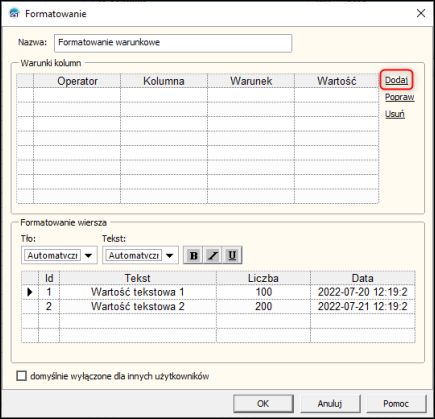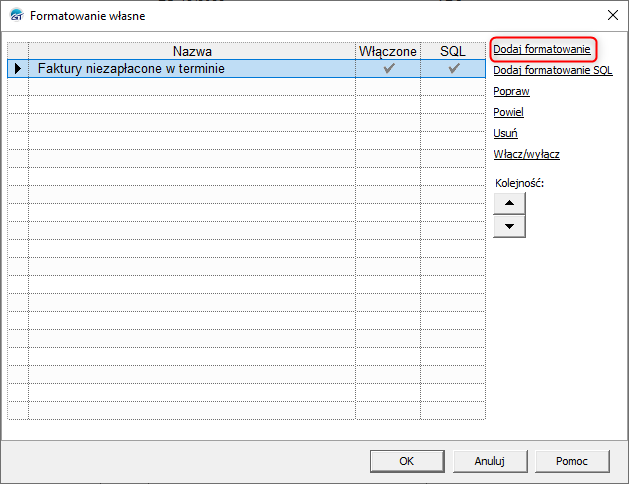 2. W oknie Formatowanie własne wybrać opcję Dodaj formatowanie.