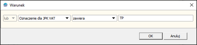 4. W oknie Warunek wybrać Oznaczenie dla JPK_VAT zawiera TP i zatwierdzić OK.
