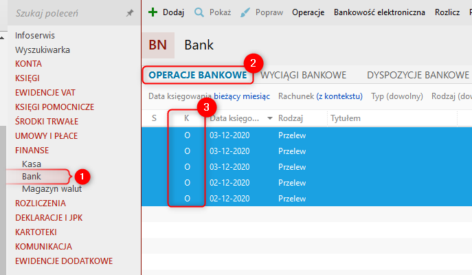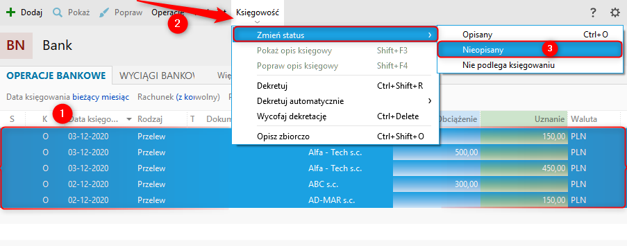 2. Wybrać z górnego menu Księgowość – Zmień status – Nieopisany.