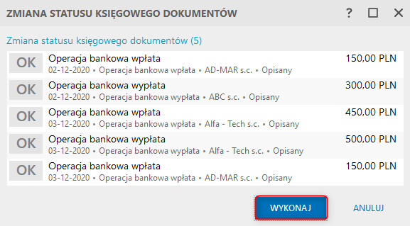 3. W oknie zmiany statusu księgowego dokumentów wybrać Wykonaj.