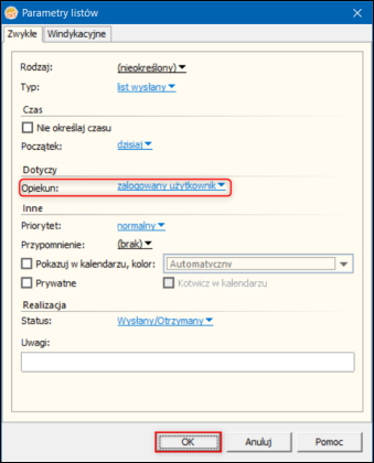 2. W oknie Parametry listów wybrać domyślnego Opiekuna. Zmiany zapisać przyciskiem OK.