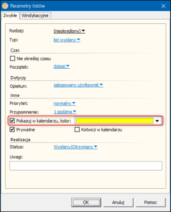 2. W oknie Parametry listów zaznaczyć opcję Pokazuj w kalendarzu i wybrać domyślny Kolor. Zmiany zapisać przyciskiem OK.
