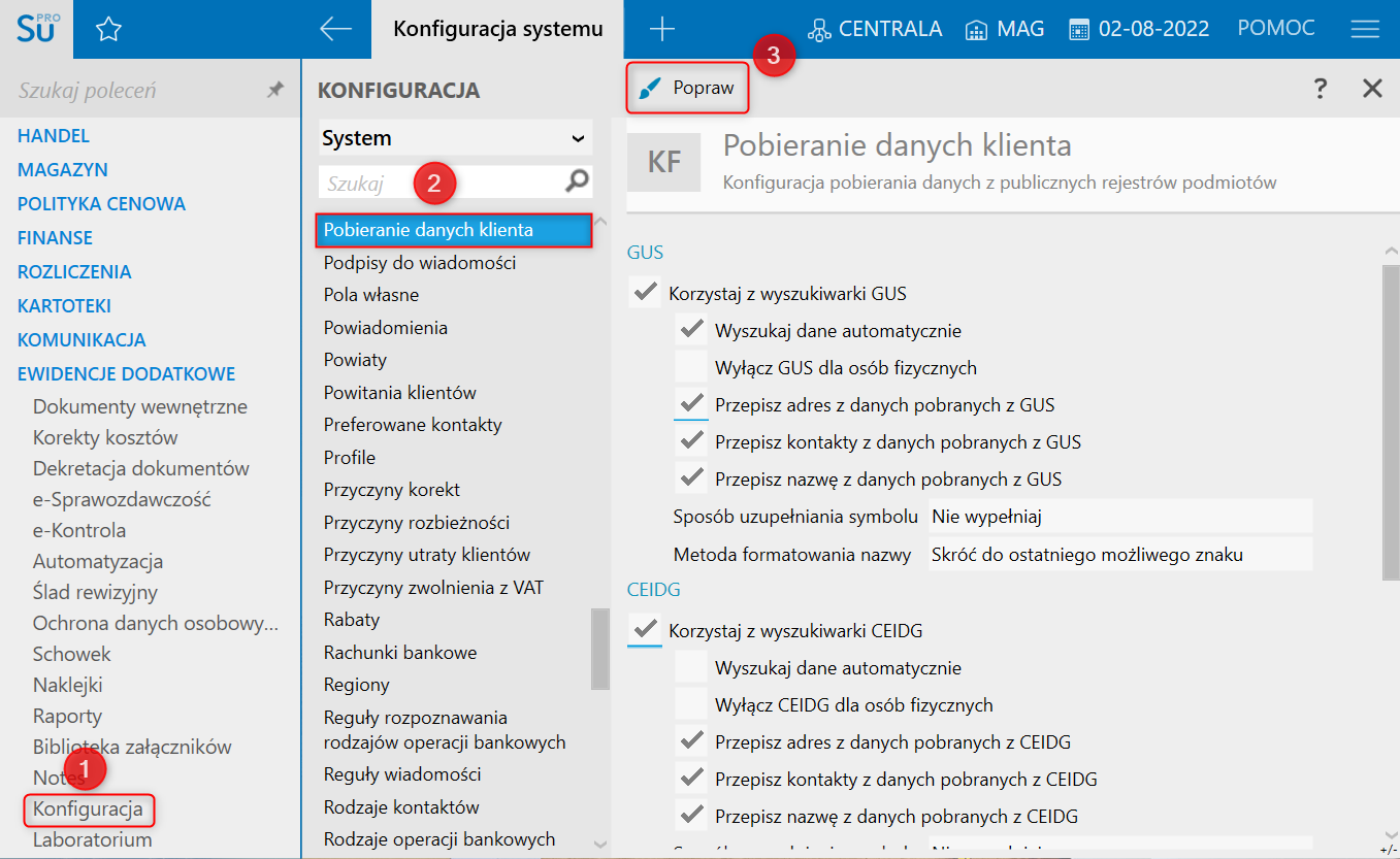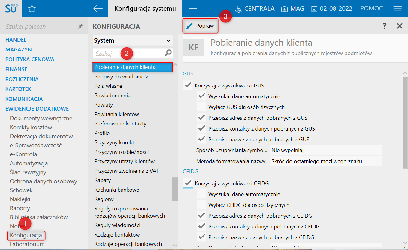 1. Przejść do modułu Ewidencje dodatkowe – Konfiguracja – Pobieranie danych klienta i kliknąć Popraw.