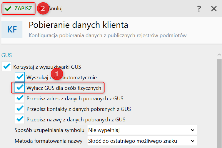 2. W sekcji GUS zaznaczyć opcję Wyłącz GUS dla osób fizycznych i zapisać zmiany.