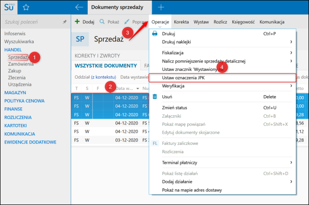 1. Przejść do modułu Sprzedaż, zaznaczyć pozycje dokumentów na liście, a następnie wybrać z górnego Operacje – Ustaw oznaczenia JPK.