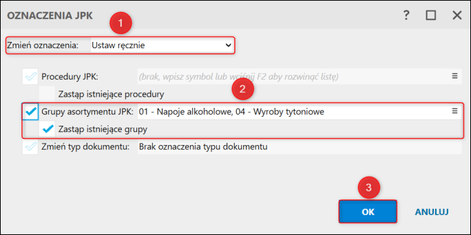 2. Parametr Zmień oznaczenia ustawić na Ustaw ręcznie, następnie zaznaczyć Grupy asortymentu JPK i wybrać z listy grupę asortymentu oraz określić, czy mają zostać Zastąpione istniejące grupy. Zatwierdzić przyciskiem OK.
