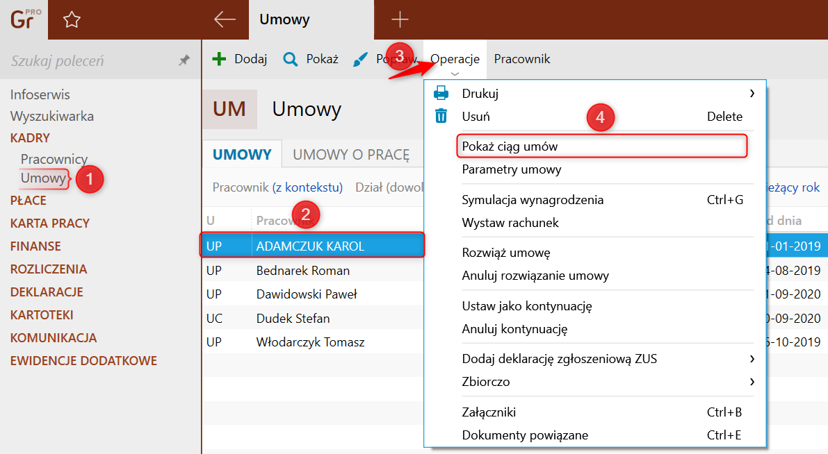 W module Kadry – Umowy, w menu Operacje znajdują się działania, które mogą być wykonane na wybranej umowie, a jednym z nich jest Pokaż ciąg umów.