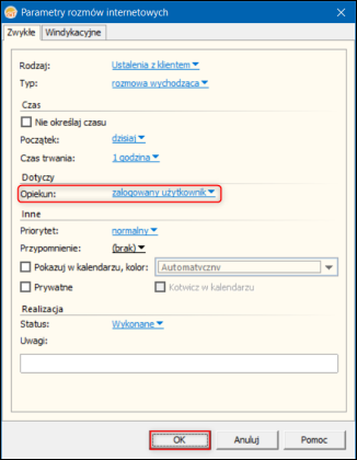 2. W oknie Parametry rozmów internetowych wybrać domyślnego Opiekuna. Zmiany zapisać przyciskiem OK.