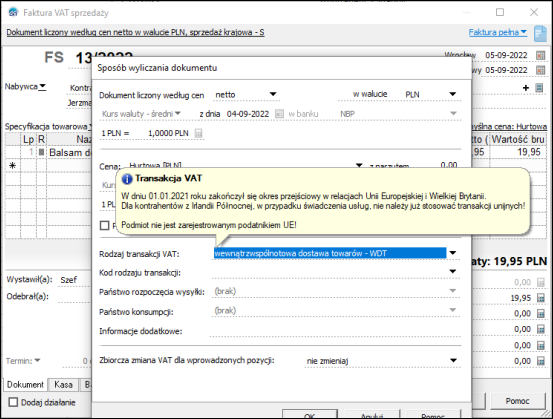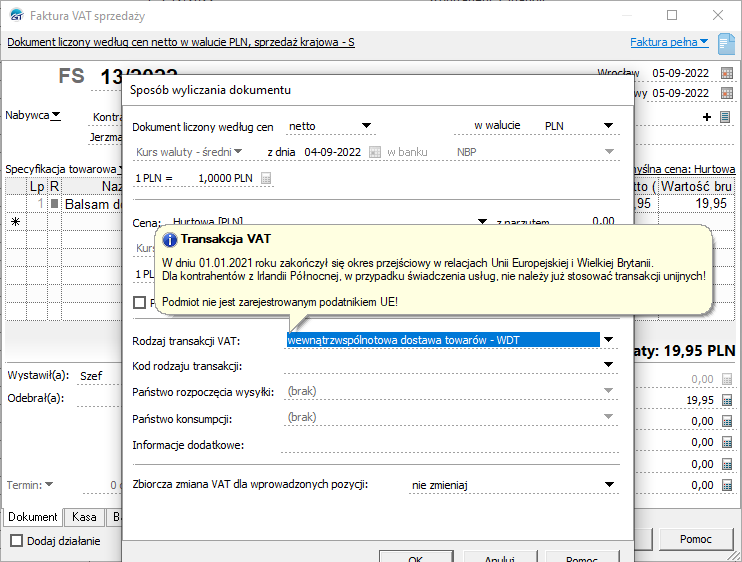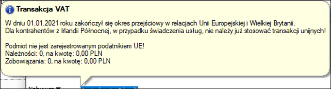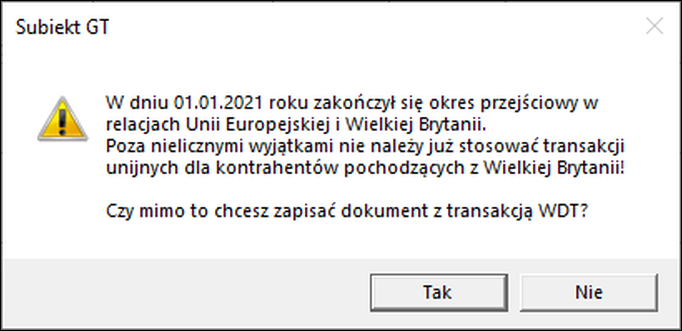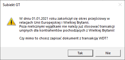 W programie zaimplementowano odpowiednie ostrzeżenie dla użytkownika, przypominające o konieczności ustawienia odpowiedniej transakcji. W przypadku, gdy podczas wprowadzania dokumentu dla kontrahenta z Wielkiej Brytanii zostanie wybrana jedna z transakcji unijnych, zostanie wyświetlone następujące ostrzeżenie: