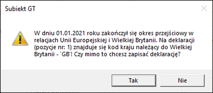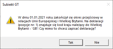 Podczas zapisu deklaracji Intrastat za miesiąc z 2021 roku, na której znajdują się pozycje z kodem kraju GB, także wyświetlany jest komunikat ostrzegający: