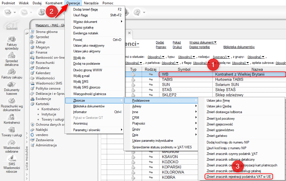 W przypadku podmiotów założonych w wersji 1.66 lub wcześniejszej należy dokonać zmian dotyczących kontrahentów wprowadzonych wcześniej do systemu. W tym celu w module Kontrahenci można dla klientów z Wielkiej Brytanii skorzystać z operacji zbiorczej do usunięcia znacznika „Podatnik VAT zarejestrowany w UE". Operacja jest dostępna w operacjach zbiorczych w grupie Podstawowe.