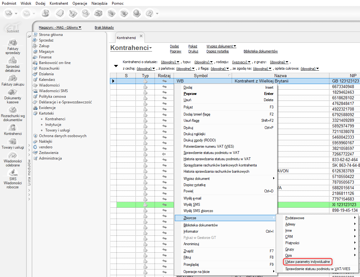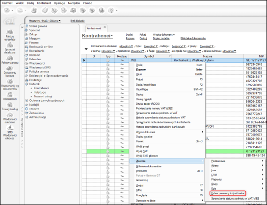 Kolejnym krokiem jest zmiana domyślnie przypisanej transakcji handlowej przy sprzedaży oraz zakupie, dla kontrahentów z Wielkiej Brytanii oraz Irlandii Północnej. W tym celu można posłużyć się operacją zbiorczą Ustaw parametry indywidualne, dostępna w menu kontekstowym.