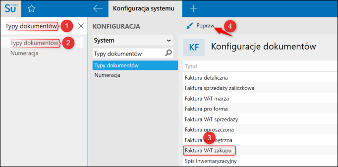 1. W lewym, górnym rogu programu, w wyszukiwarce wpisać Typy dokumentów, wejść w wyszukany moduł, zaznaczyć Fakturę VAT zakupu i kliknąć górne menu Popraw.