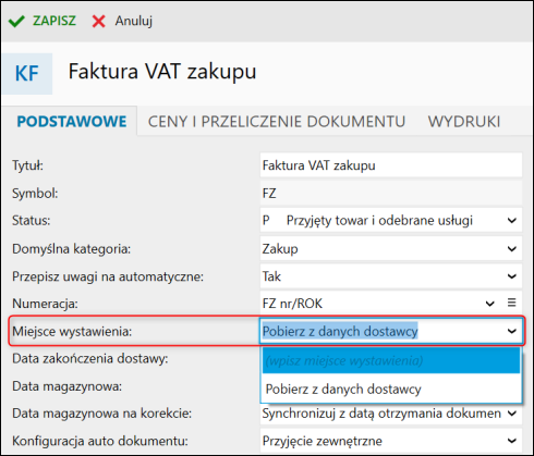 2. Określić domyślne pobieranie Miejsca wystawienia i zatwierdzić przyciskiem Zapisz.
