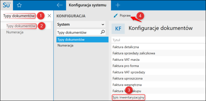 1. W lewym, górnym rogu programu, w wyszukiwarce wpisać Typy dokumentów, wejść w wyszukany moduł, zaznaczyć Spis inwentaryzacyjny i kliknąć górne menu Popraw.