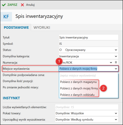 Aby określić domyślne miejsce wystawienia dla spisu inwentaryzacyjnego, należy: