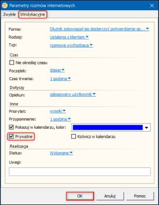 2. W oknie Parametry rozmów internetowych wejść na zakładkę Windykacyjne i zaznaczyć opcję Prywatne. Zmiany zapisać przyciskiem OK.