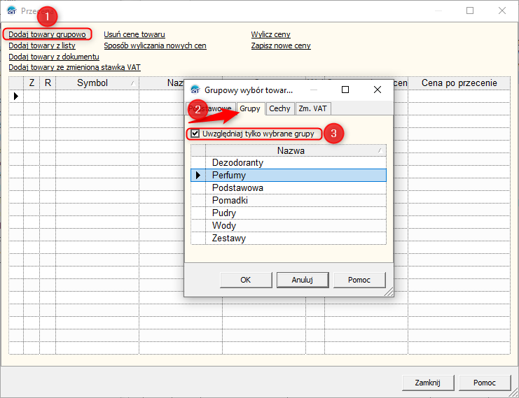2. W oknie przeceny wybrać towary opcją Dodaj towary grupowo. Następnie przejść do zakładki Grupy, zaznaczyć opcję Uwzględniaj tylko wybrane grupy i zaznaczyć interesującą nas grupę.