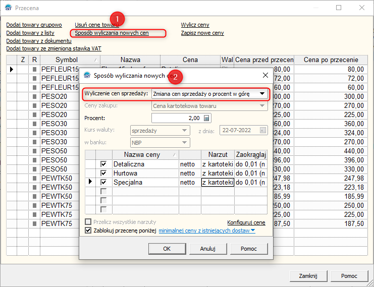 3. Określić Sposób wyliczania nowych cen, czy to o kwotę, czy procent w górę lub w dół.