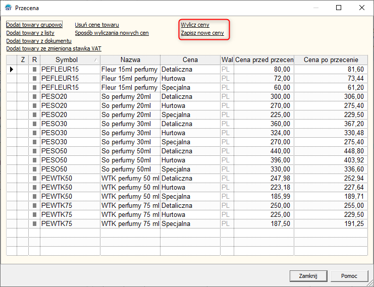 4. Wybrać opcję Wylicz ceny. Spowoduje to tylko przeliczenie nowych cen i wyświetlenie ich w kolumnie Cena po przecenie. Wybór opcji Zapisz nowe ceny spowoduje aktualizację cen w kartotekach towarów. Po tej operacji możemy zamknąć okno przeceny.
