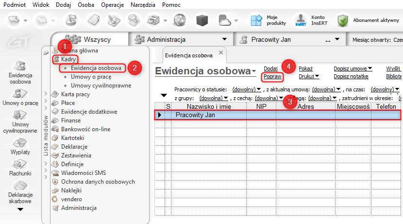 1. Przejść do modułu Kadry ​ Ewidencja osobowa i edytować kartotekę wybranego pracownika klikając Popraw.