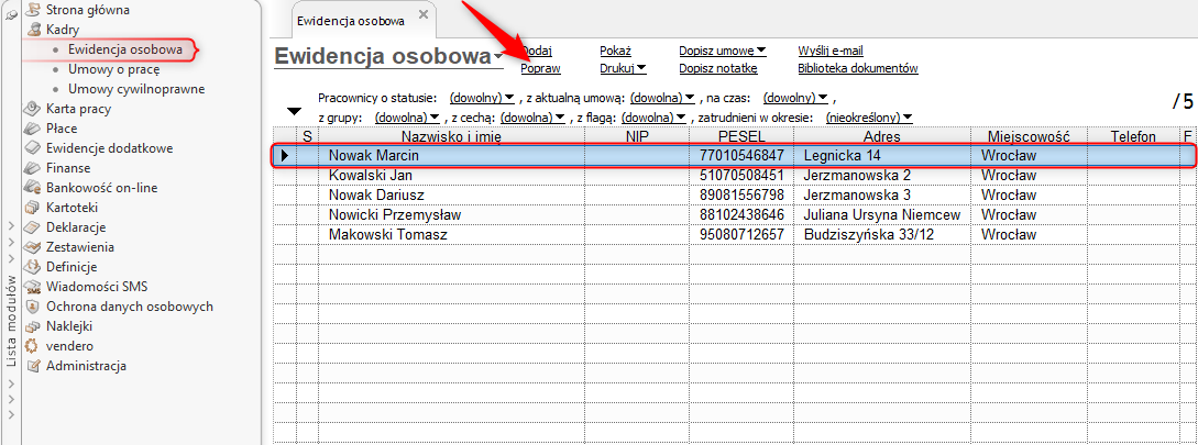 1. Przejść do modułu Kadry – Ewidencja osobowa i edytować kartotekę wybranego pracownika klikając Popraw.