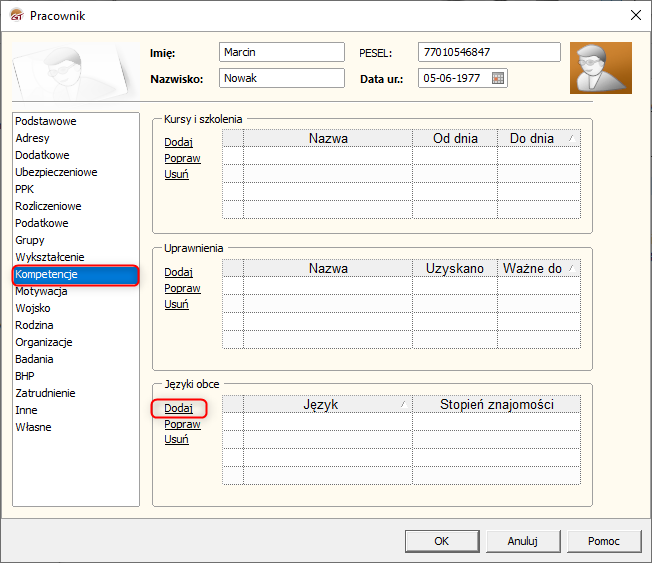Aby wprowadzić informacje o językach obcych i stopniu ich znajomości przez pracownika, należy: