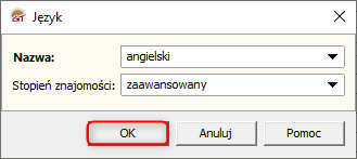 3. Wprowadzić język i stopień znajomości, następnie zatwierdzić przyciskiem OK.