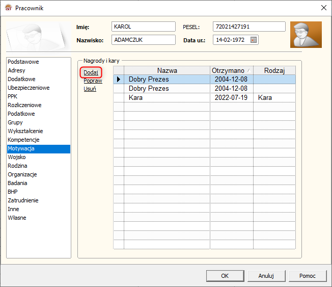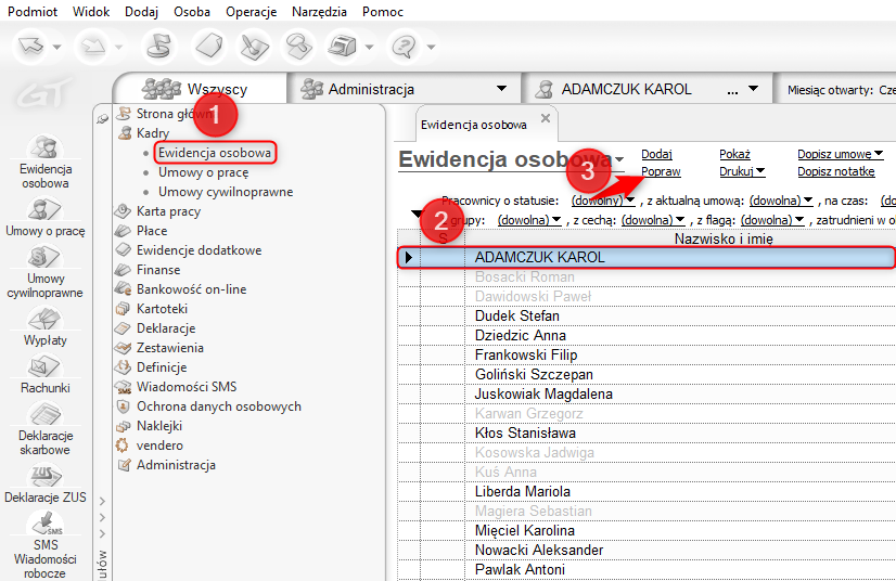 1. Przejść do modułu Kadry – Ewidencja osobowa i edytować kartotekę wybranego pracownika klikając Popraw.