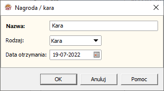 3. Wprowadzić nazwę, datę otrzymania i ustawić rodzaj jako Kara, a następnie zapisać przyciskiem OK.