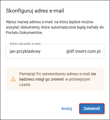 3. Uzupełnić Adres skrzynki e-mail, na który będą przesyłane wiadomości wraz z dokumentami i wybrać Zatwierdź.