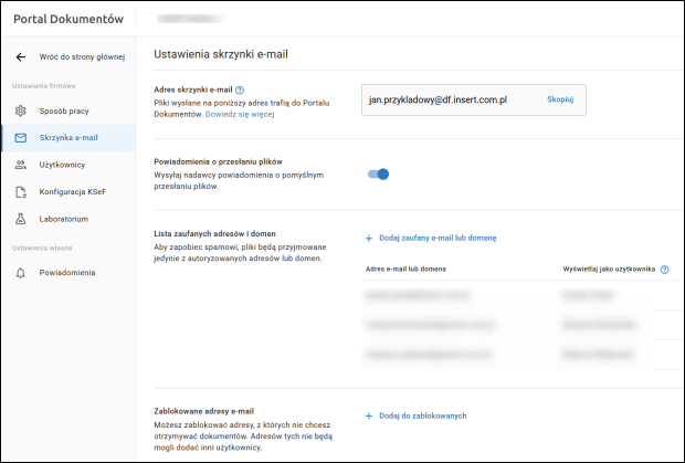 Do Listy zaufanych adresów automatycznie są dodawane adresy użytkowników posiadających konta w Portalu Dokumentów. Administrator może dodać kolejne zaufane adresy oraz domeny, z których przyjmowane będą dokumenty.