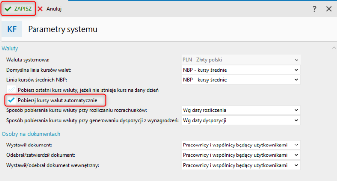 2. Zaznaczyć opcję Pobieraj kursy walut automatycznie. Zmiany zatwierdzić przyciskiem Zapisz.