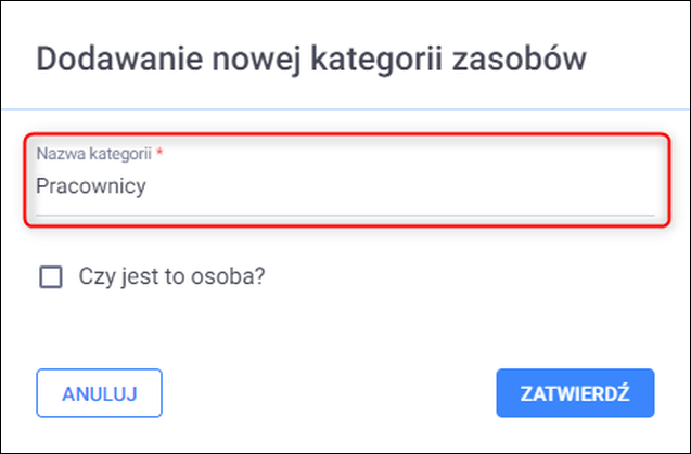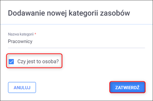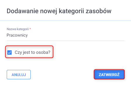 Aby oznaczyć kategorię, jako osoby wykonujące usługi należy w oknie Dodawanie kategorii zaznaczyć opcję Czy jest to osoba?. Należy zdefiniować co najmniej jedną kategorię zasobów. Zmiany zapisać przyciskiem Zatwierdź.