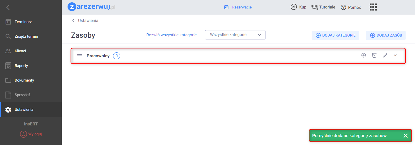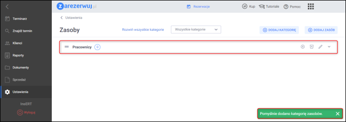 Rezultatem wprowadzonych zmian będzie pojawienie się nowo dodanej kategorii zasobów na liście i wyświetlenie stosownego komunikatu – Pomyślnie dodano kategorię zasobów.