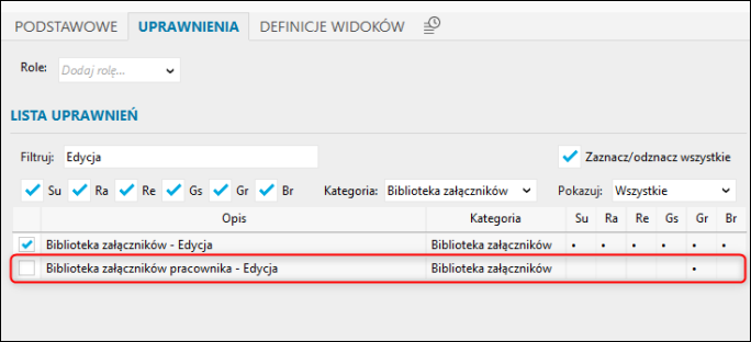 2. Przejść na zakładkę Uprawnienia, w polu wyszukiwania Filtruj wpisać Edycja w kategorii Biblioteka załączników. W kolejnym kroku należy odznaczyć uprawnienie Biblioteka załączników pracownika – Edycja. Aby zatwierdzić zmiany, należy wybrać Zapisz.