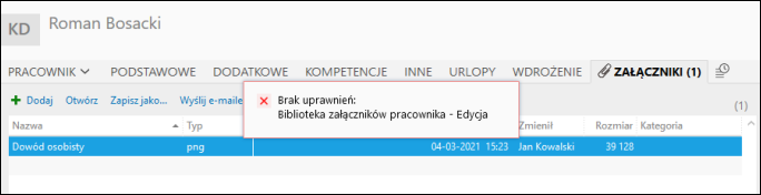 Rezultatem powyższej operacji będzie blokada możliwości edycji plików z biblioteki załączników pracownika.