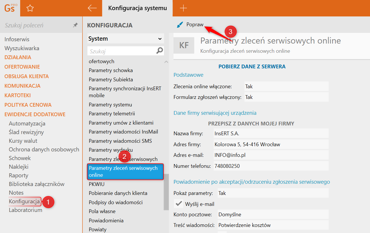 1. Przejść do modułu Ewidencje dodatkowe – Konfiguracja – Parametry zleceń serwisowych online i kliknąć Popraw.