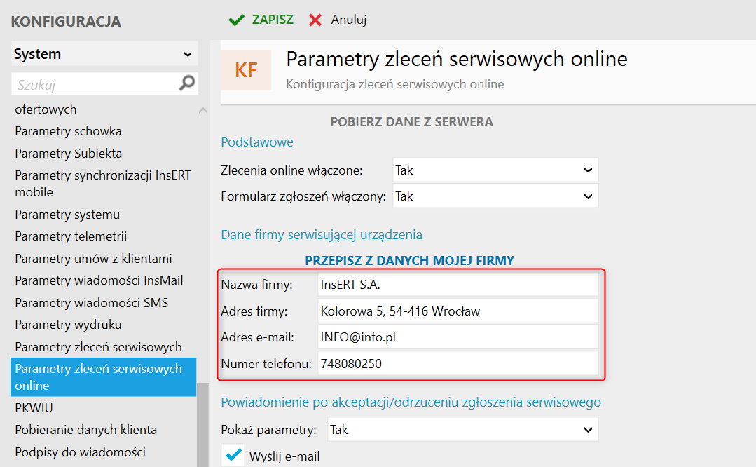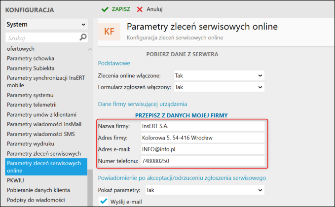 Gestor nexo – Jak zmienić dane firmy wyświetlane w formularzu zgłoszeniowym usługi Zlecenia serwisowe online?