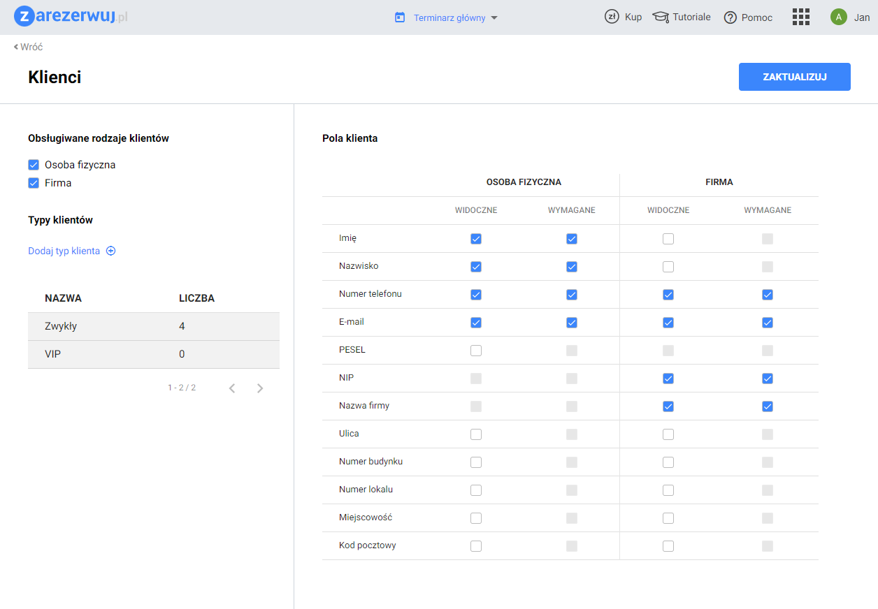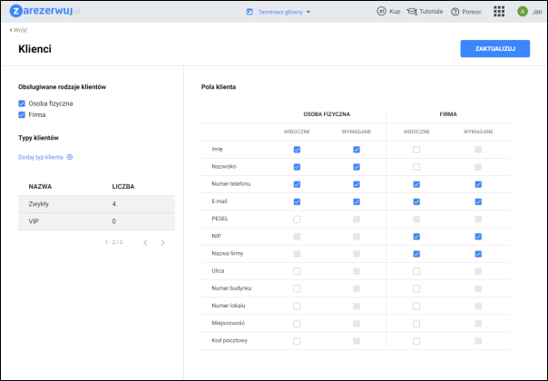 2. Wybrać obsługiwany rodzaj klientów oraz zaznaczyć wymagane i widoczne pola klienta. Zmiany zatwierdzić przyciskiem Zaktualizuj.