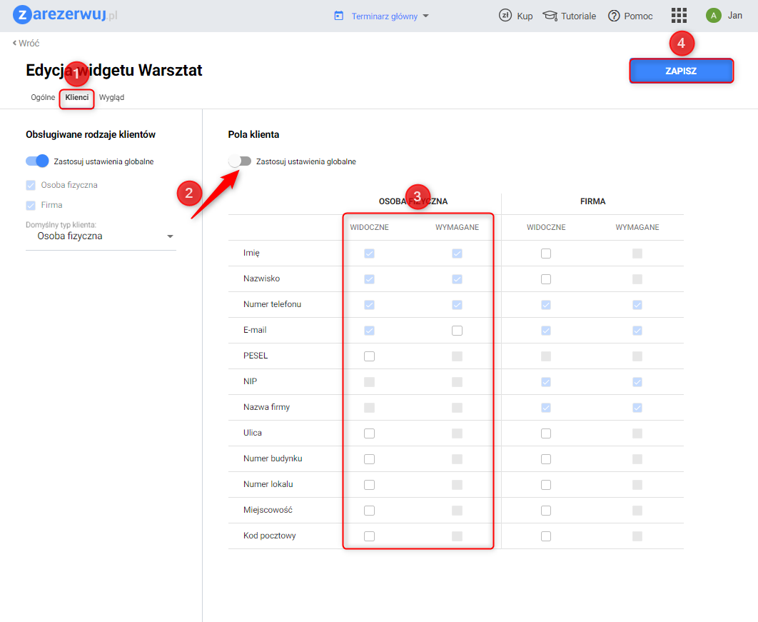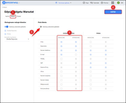 zarezerwuj.pl – Jak skonfigurować pola dotyczące klientów?